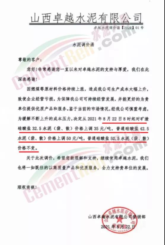 山西卓越水泥有限公司通知,因燃煤等原材料價格持續(xù)上漲,造成公司生產(chǎn)成本大幅上升,致使企業(yè)經(jīng)營虧損,為保障公司可持續(xù)經(jīng)營發(fā)展,經(jīng)公司慎重考慮,為緩解不斷上升的成本壓力,決定從8月22日8時起對礦渣硅酸鹽32.5水泥價格上調(diào)35元/噸,普通硅酸鹽水泥42.5價格上調(diào)50元/噸。