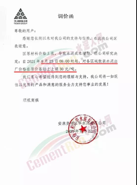 安康堯柏江華水泥有限公司通知,因原材料價格上漲,導致水泥成本增加。經(jīng)公司研究決定,自8月23日8時起,對各區(qū)域散裝水泥出廠價格在原價基礎(chǔ)上上調(diào)30元/噸。