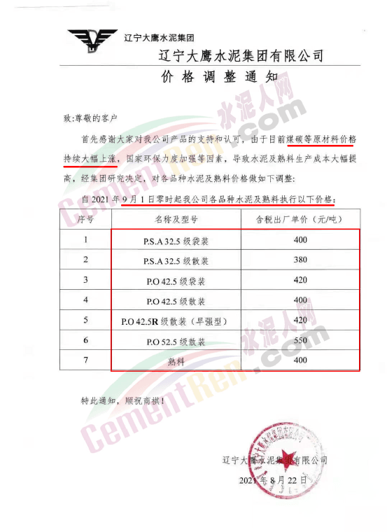 日前,遼寧大鷹水泥集團有限公司通知,由于目前煤炭等原材料價格持續(xù)大幅上漲,國家環(huán)保力度加強等因素,導致水泥及熟料生產(chǎn)成本大幅提高,經(jīng)集團研究決定,自9月1日起公司各品種水泥及熟料執(zhí)行最新價格。其中P.O42.5散裝水泥和熟料均執(zhí)行400元/噸。P.O52.5散裝水泥執(zhí)行550元/噸。