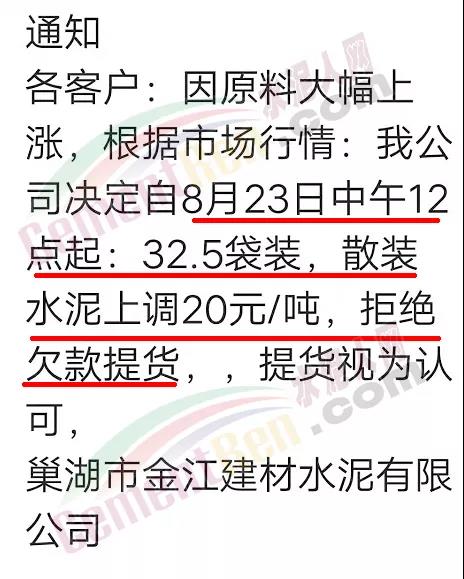 巢湖市金江建材水泥有限公司通知客戶∶因原料大幅上漲,根據(jù)市場行情公司決定自8月23日中午12點起32.5袋裝,散裝水泥上調(diào)20元/噸,拒絕欠款提貨,提貨視為認可。