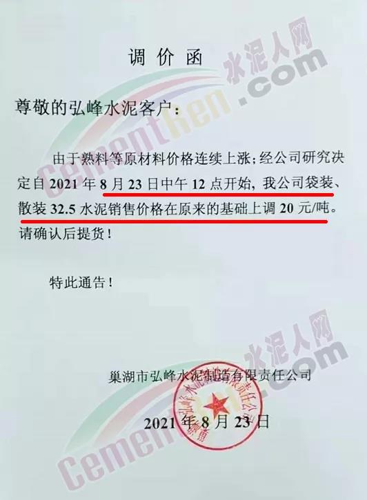 巢湖市弘峰水泥制造有限責任公司通知由于熟料等原材料價格連續(xù)上漲,經(jīng)公司研究決定,自8月23日12時開始公司32.5標號水泥銷售價格在原基礎(chǔ)上上調(diào)20元/噸。