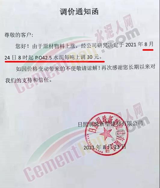 日照明珠新型建材有限公司通知,由于原材料物料上漲,經(jīng)公司研究決定于8月24日起P.O42.5上調(diào)30元/噸。