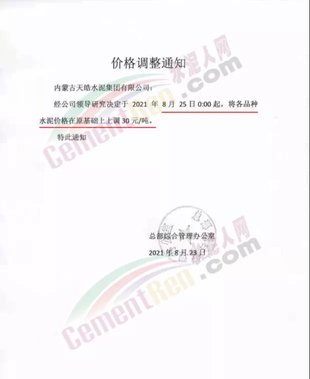 總部綜合管理辦公室通知內(nèi)蒙古天皓水泥集團有限公司稱,經(jīng)公司領(lǐng)導研究決定于8月25日0時起,將各品種水泥價格在原基礎(chǔ)上上調(diào)30元/噸。