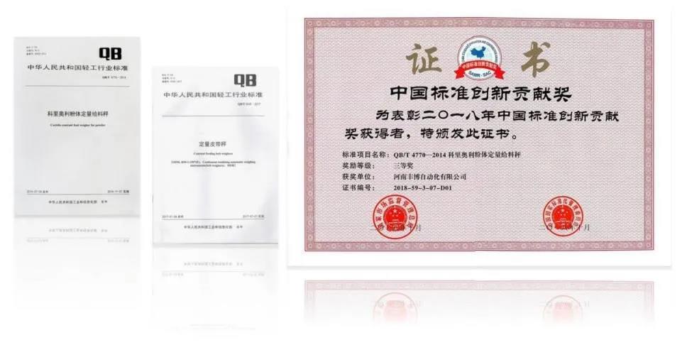 豐博自動(dòng)化是一家從事動(dòng)態(tài)計(jì)量行業(yè)20多年的老牌企業(yè),成立了動(dòng)態(tài)計(jì)量研究院,并擁有完備的固體顆粒狀物料連續(xù)計(jì)量的實(shí)驗(yàn)裝置和先進(jìn)的粉體連續(xù)計(jì)量實(shí)驗(yàn)裝置。在計(jì)量研究上,榮獲多項(xiàng)國(guó)家專利及軟件著作權(quán)。并且,由經(jīng)河南省質(zhì)量技術(shù)監(jiān)督局推薦,豐博自動(dòng)化負(fù)責(zé)牽頭領(lǐng)銜制定的行業(yè)標(biāo)準(zhǔn)《QB/T4770-2014科里奧利粉體定量給料秤》項(xiàng)目,榮獲2018年中國(guó)標(biāo)準(zhǔn)創(chuàng)新貢獻(xiàn)獎(jiǎng)三等獎(jiǎng)。