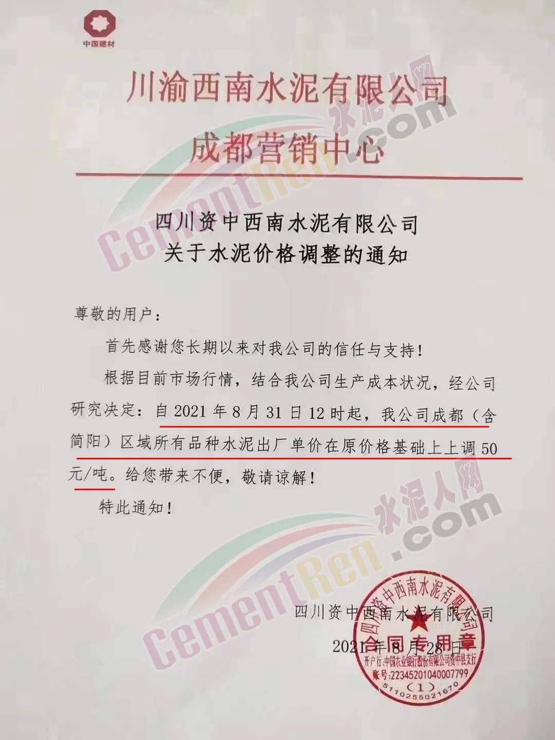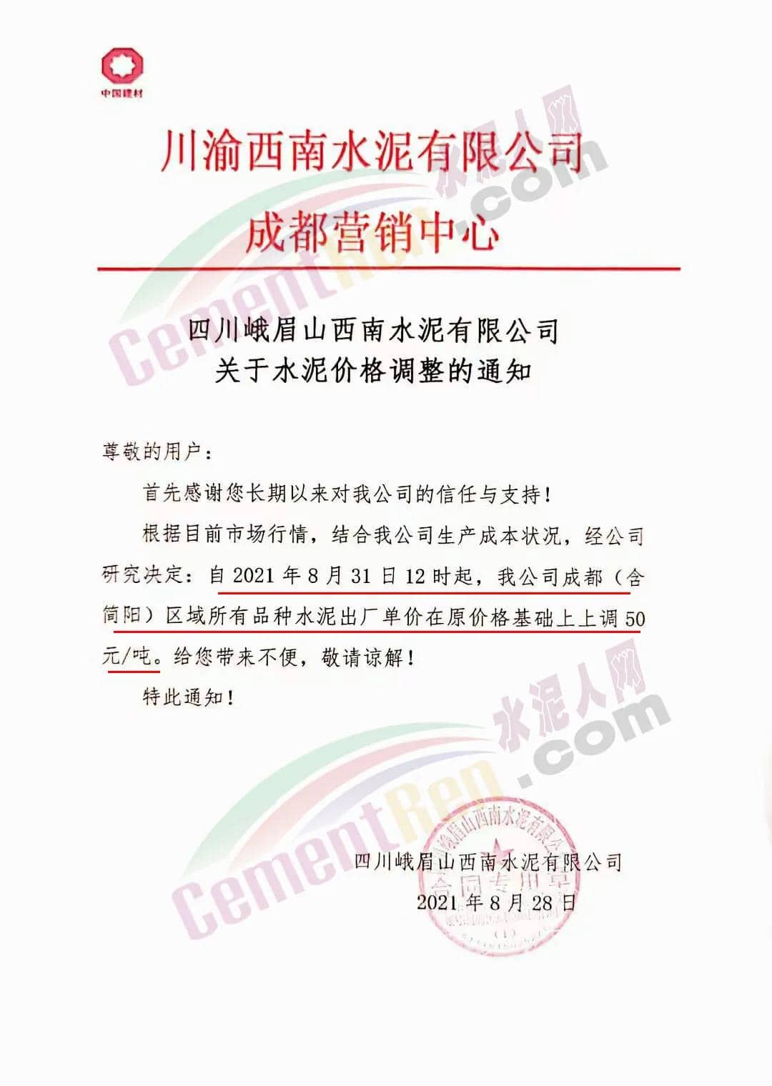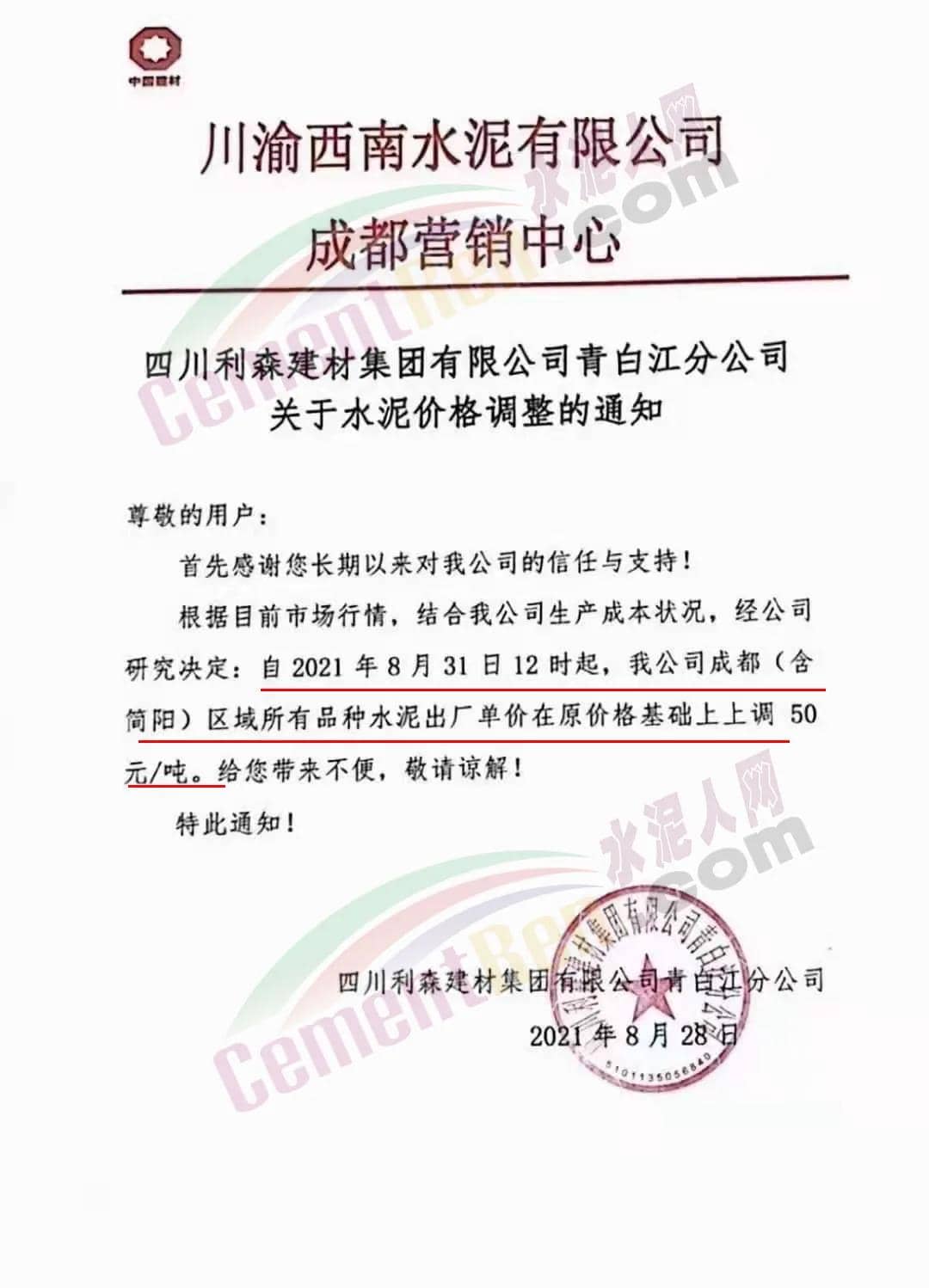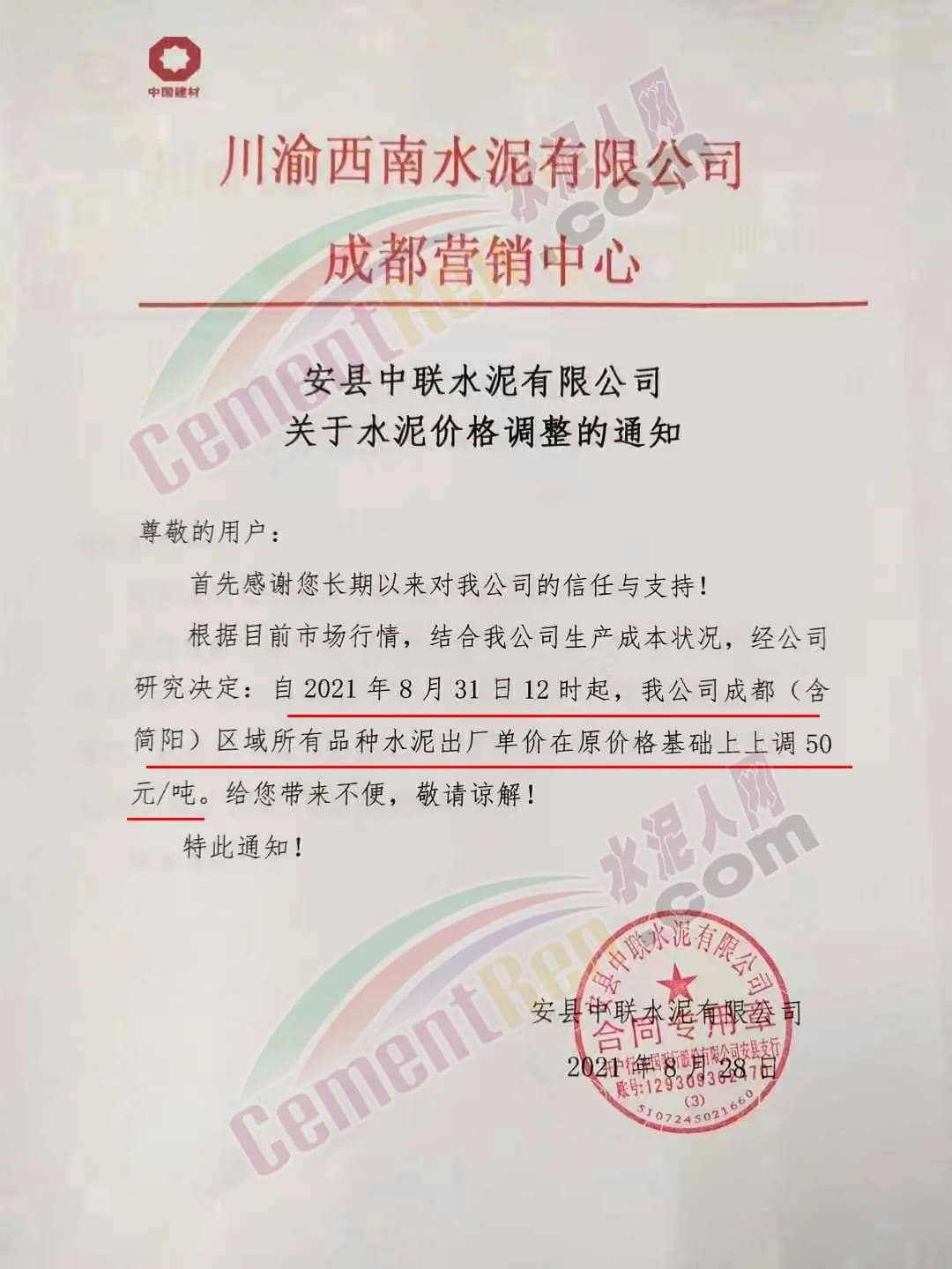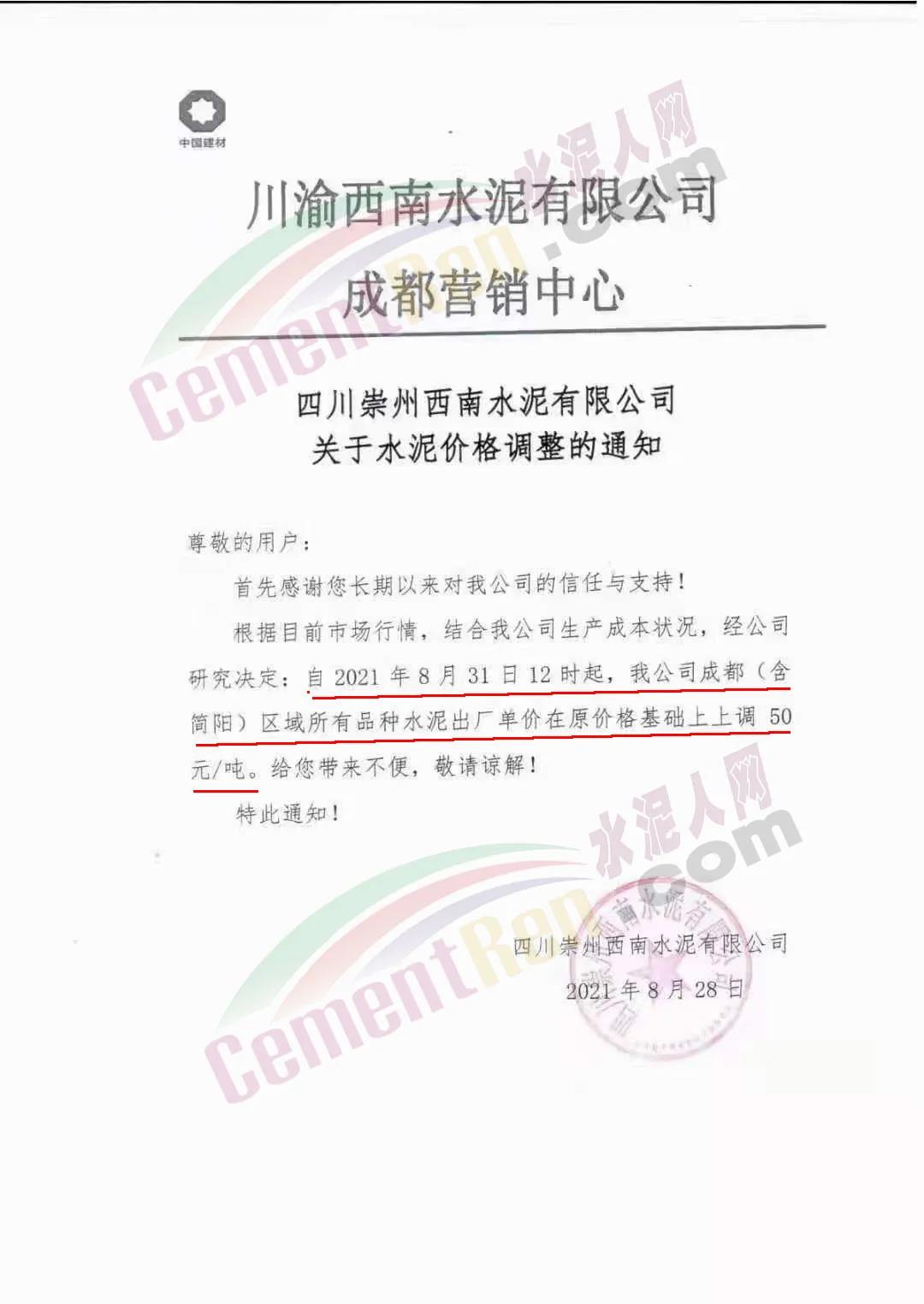 安縣中聯水泥、崇州西南水泥、四川德勝集團、峨眉山西南水泥、四川利森集團、綿竹澳東水泥、女媧建材等通知稱,根據目前市場行情 ,結合公司生產成本狀態,經公司研究決定自8月31日12時起,成都(含簡陽)區域所有品牌水泥出廠單價在原價基礎上上調50元/噸。