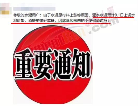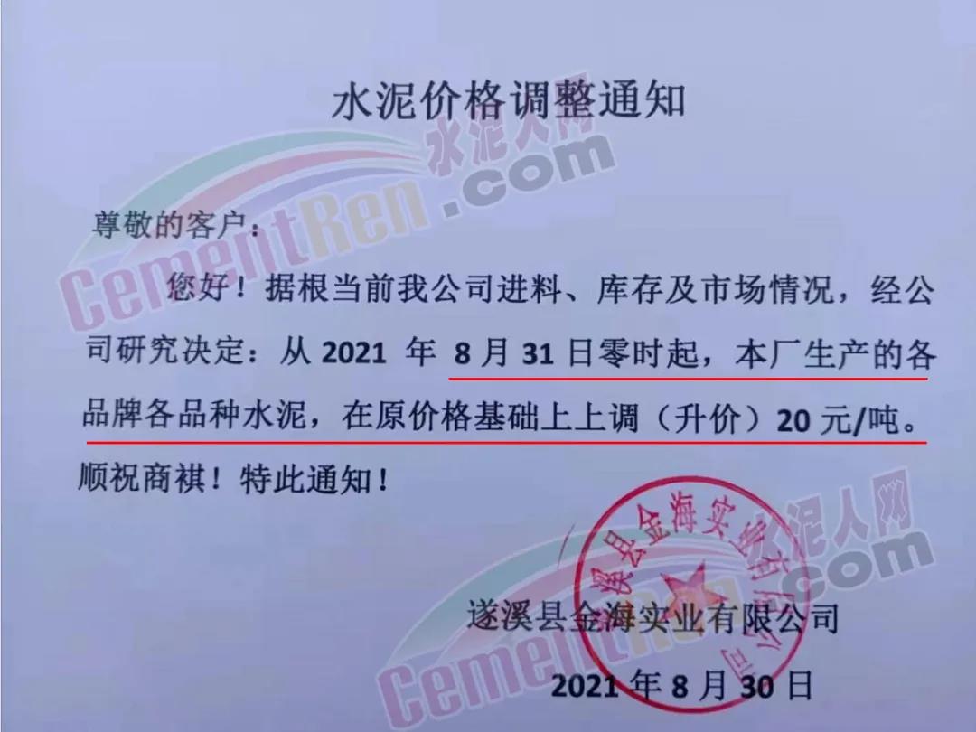 同日,廣東省湛江市遂溪縣金海實業有限公司通知,據根當前公司進料、庫存及市場情況,經研究決定從2021年8月31日零時起,本廠生產的各品牌各品種水泥,在原價格基礎上上調20元/噸。