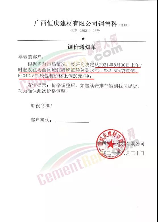 廣西恒慶建材有限公司銷售科通知根據當前市場情況,經研究決定從2021年8月30日上午7時起發往粵西區域紅獅牌紙袋包裝水泥,M32.5紙袋包裝、P.042.5紙袋包裝價格上調20元/噸。