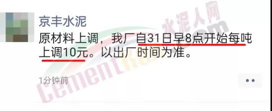 唐山京豐水泥通知,自8月31日起上調水泥價格10元/噸。