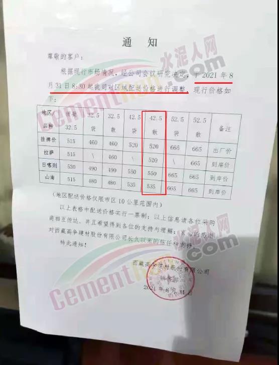 水泥人網(wǎng)通訊員消息,自8月31日起,西藏區(qū)域高爭、華新、中材祁連山、城投祁連山等品牌水泥價格上調(diào)50元/噸。