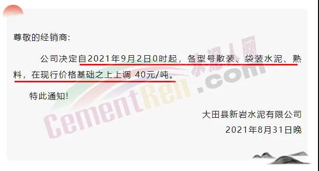 大田縣新巖水泥有限公司通知稱,公司決定自2021年9月2日0時起,各型號散裝、袋裝水泥、熟料,在現(xiàn)行價格基礎之上上調(diào) 40元/噸。