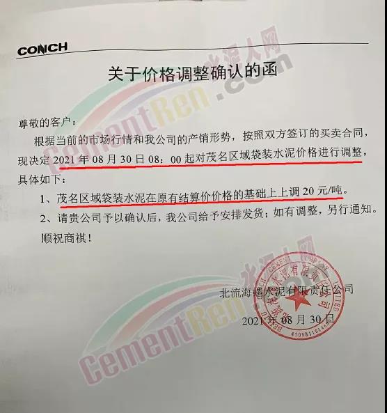 北流海螺水泥通知,根據(jù)當前的市場行情和公司的產(chǎn)銷形勢,按照雙方簽訂的買賣合同,決定自2021年8月30日8時起對茂名區(qū)域袋裝水泥結算價上調(diào)20元/噸。