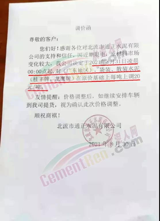 北流市通正水泥有限公司通知稱,因近期限電,原材料市場變化較大,公司決定于2021年8月31日凌晨0時起,對(廣東地區(qū)),袋裝、散裝水泥(桂豐牌,龍鷹牌)在原價基礎上上調(diào)20元/噸。