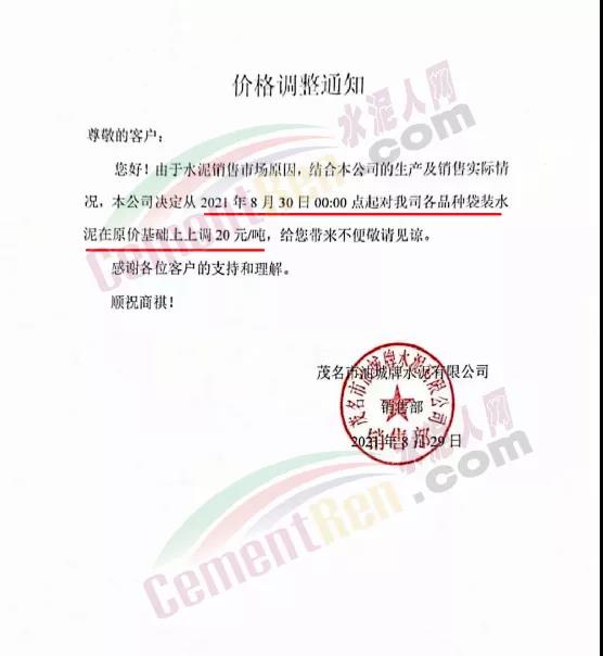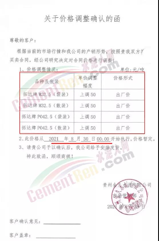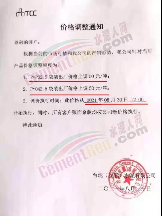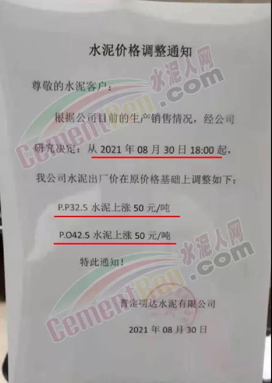 貴州省安順市普定縣普定明達水泥有限公司通知根據(jù)公司目前的生產(chǎn)銷售情況,經(jīng)公司研究決定從2021年8月30日18時起,公司水泥出廠價在原價格基礎上P.P32.5水泥上漲50元/噸,P.O42.5水泥上漲50元/噸。