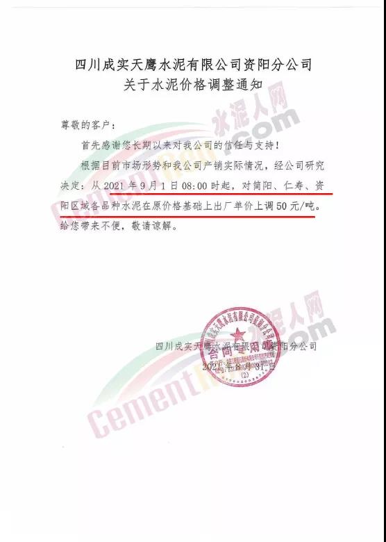 四川成實天鷹水泥有限公司資陽分公司通知根據(jù)目前市場形勢和公司產(chǎn)銷實際情況,經(jīng)公司研究決定從2021年9月1日8時起,對簡陽、仁壽、資陽區(qū)域各品種水泥在原價格基礎上出廠單價上調(diào)50元/噸。