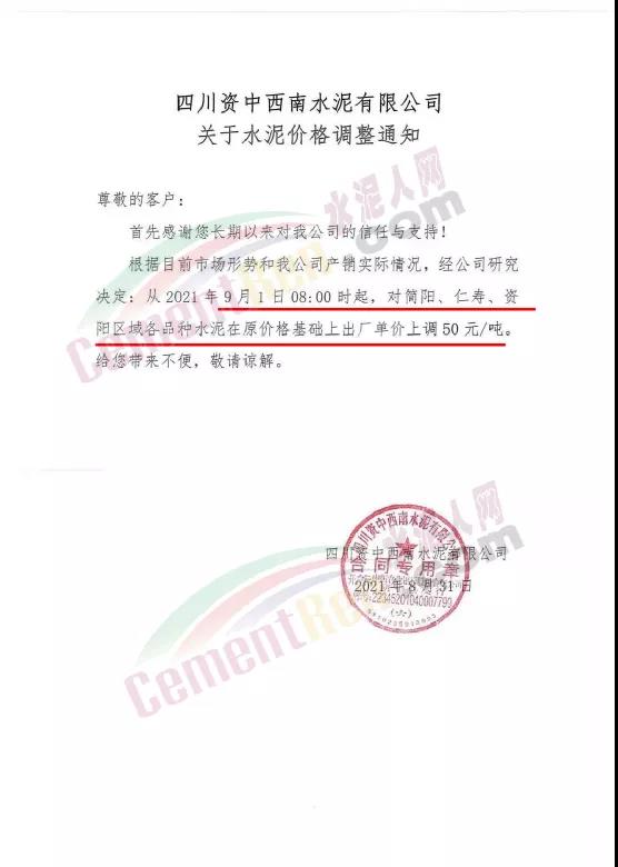 四川資中西南水泥有限公司通知根據(jù)目前市場形勢和公司產(chǎn)銷實際情況,經(jīng)公司研究決定,從9月1日8時起,對簡陽、仁壽、資陽區(qū)域各品種水泥在原價格基礎上出廠單價上調(diào)50元/噸。