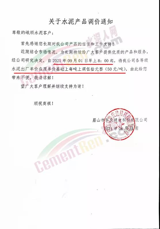 眉山市華慶建材科技有限公司通知結合市場情況,為長期持續(xù)給廣大客戶提供優(yōu)質(zhì)的產(chǎn)品和服務,經(jīng)公司研究決定,自2021年9月1日8時起,將公司各等級水泥出廠單價在原單價基礎上上調(diào)50元/噸。