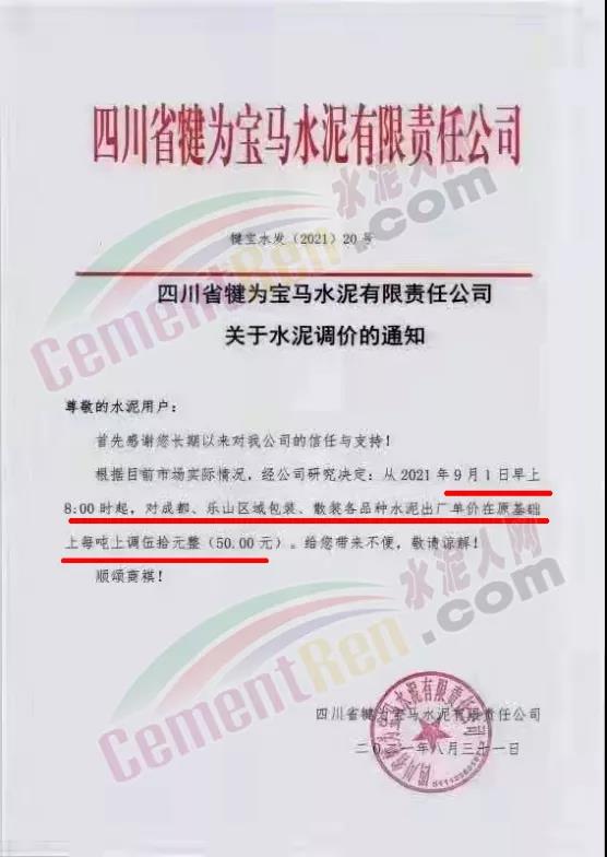 四川省犍為寶馬水泥有限責任公司通知,自9月1日早8時起,對成都、樂山區(qū)域包裝、散裝水泥出廠單價在原基礎上上調(diào)50元/噸。