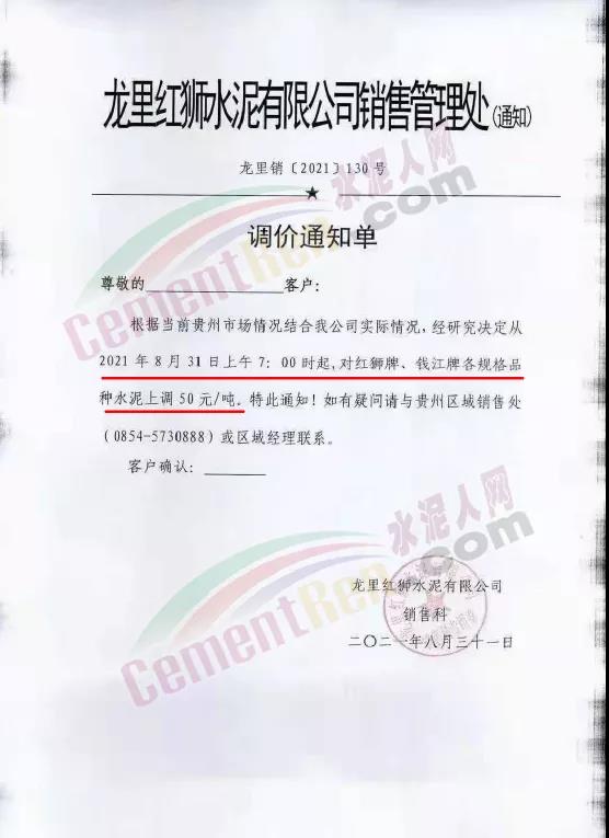 龍里紅獅水有限公司通知,根據(jù)當前貴州市場情況結合公司實際情況,經(jīng)研究決定從2021年8月31日上午7時起,對紅獅牌、錢江牌各規(guī)格品種水泥上調(diào)50元/噸。