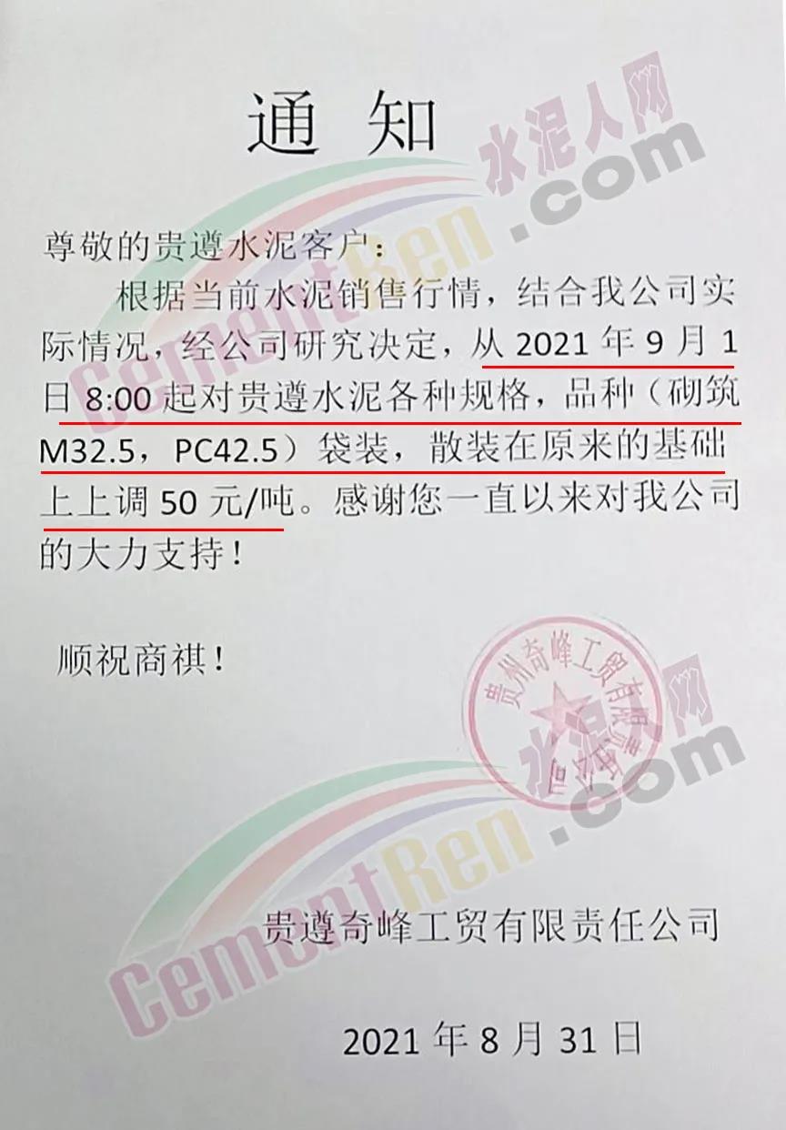 貴遵奇峰工貿(mào)有限責任公司通知,根據(jù)當前水泥銷售行情,結合公司實際情 況,經(jīng)公司研究決定,從2021年9月1日8時起對貴遵水泥各規(guī)格品種(砌筑M32.5、PC42.5)袋裝、散裝在原來的基礎上上調(diào)50元/噸。