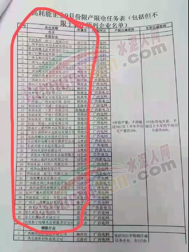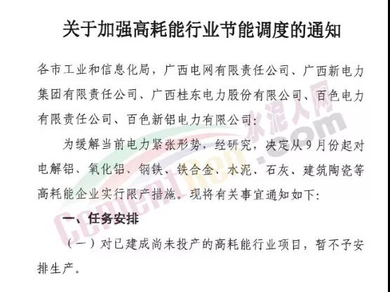 日前,廣西壯族自治區(qū)工信廳發(fā)布《關(guān)于加強(qiáng)高耗能行業(yè)節(jié)能調(diào)度的通知》給各市工業(yè)和信息化局,廣西電網(wǎng)有限責(zé)任公司、廣西新電力集團(tuán)有限責(zé)任公司、廣西桂東電力股份有限公司、百色電力有限責(zé)任公司、百色新鋁電力有限公司稱,為緩解當(dāng)前電力緊張形勢,決定從9月份起對電解鋁、氧化鋁、鋼鐵、鐵合金、水泥、石灰、建筑陶瓷等高耗能企業(yè)實(shí)行限產(chǎn)措施。