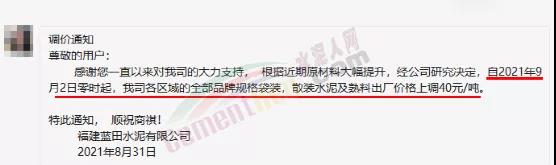 福建藍田水泥通知,因近期原材料大幅提升,經公司研究決定,自9月2日零時起,各區域全部品牌規格袋裝、散裝水泥及熟料出廠價格上調40元/噸。