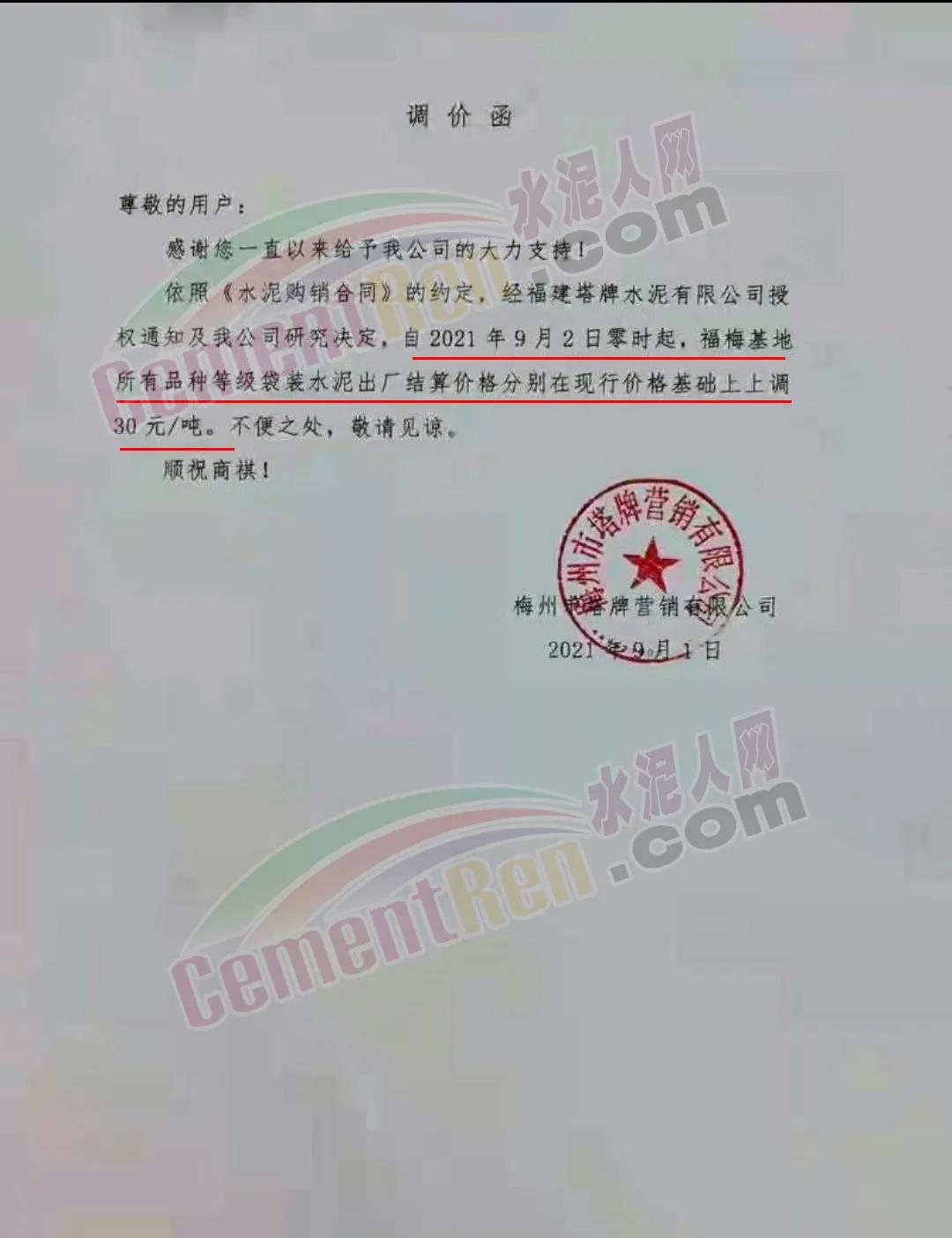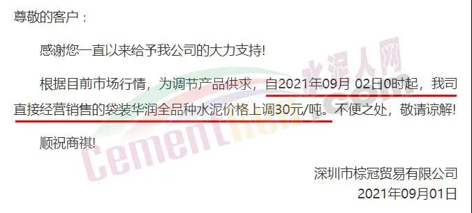 深圳市棕冠貿易有限公司通知,根據目前市場行情,為調節產品供求,自2021年9月2日0時起,公司直接經營銷售的袋裝華潤全品種水泥價格上調30元/噸。