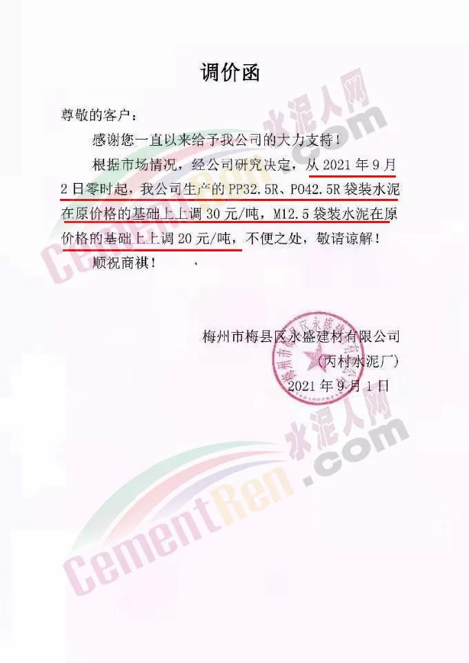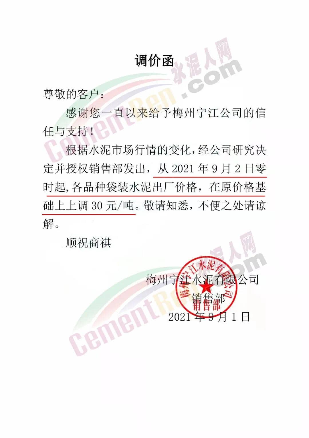 梅州寧江水泥有限公司通知,根據水泥市場行情的變化,經公司研究決定并授權銷售部發出,從 2021年9月2日零時起,各品種袋裝水泥出廠價格,在原價格基礎上上調30 元/噸。