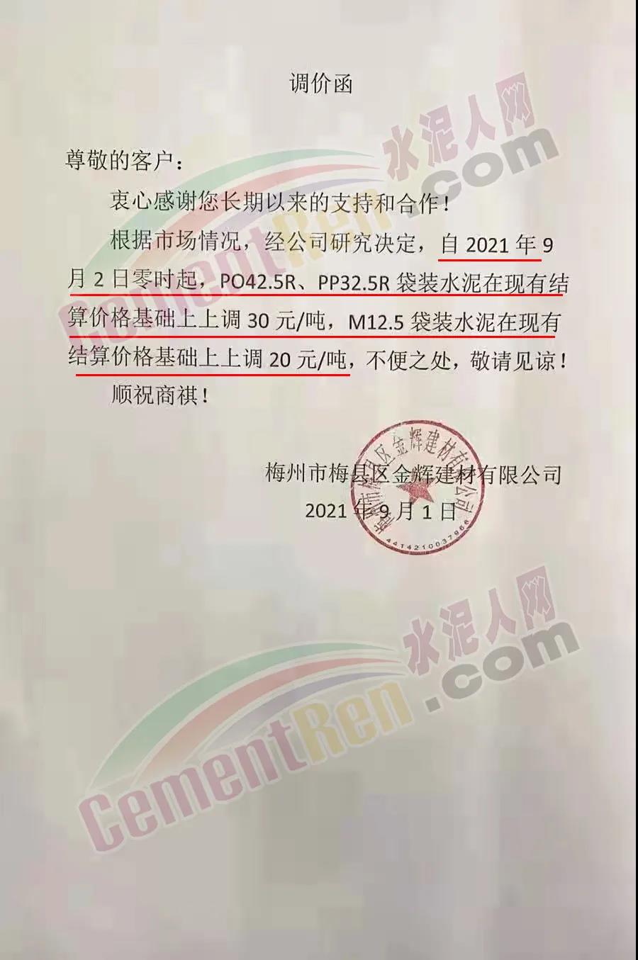 梅州市梅縣區金輝建材有限公司通知,自2021年9月2日零時起,PO42.5R、PP32.5R袋裝水泥在現有結算價格基礎上上調30元/噸,M12.5 袋裝水泥在現有結算價格基礎上上調 20 元/噸。