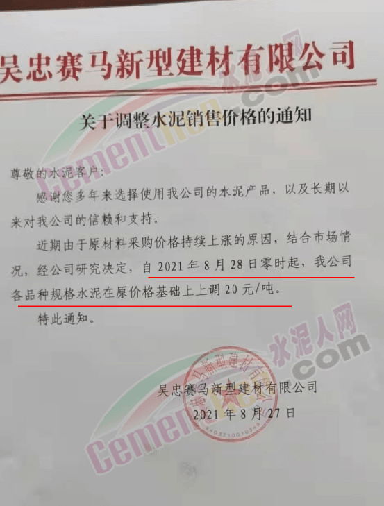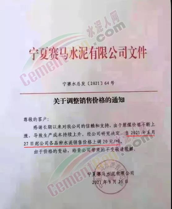 另據消息稱,寧夏區域多家品牌企業也于近日上調了水泥價格。寧夏吳忠賽馬新型建材有限公司通知 ,由于原材料采購價格持續上漲的原因,結合市場情況經公司研究決定 ,自2021年8月28日零時起,公司各品種規格水泥在原價基礎上上調20元/噸。