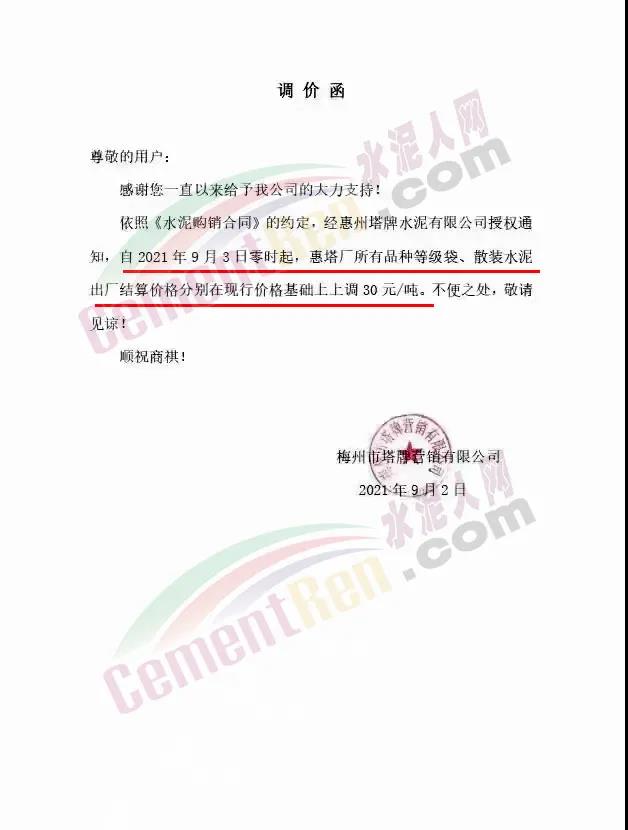 梅州塔牌營銷有限公司通知,依照《水泥購銷合同》的約定,經惠州塔牌水泥有限公司授權通知,自2021年9月3日零時起,惠塔廠所有品種等級袋、散裝水泥出廠結算價格分別在現行價格基礎上上調30元/噸。