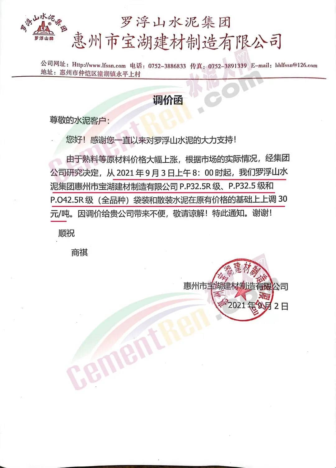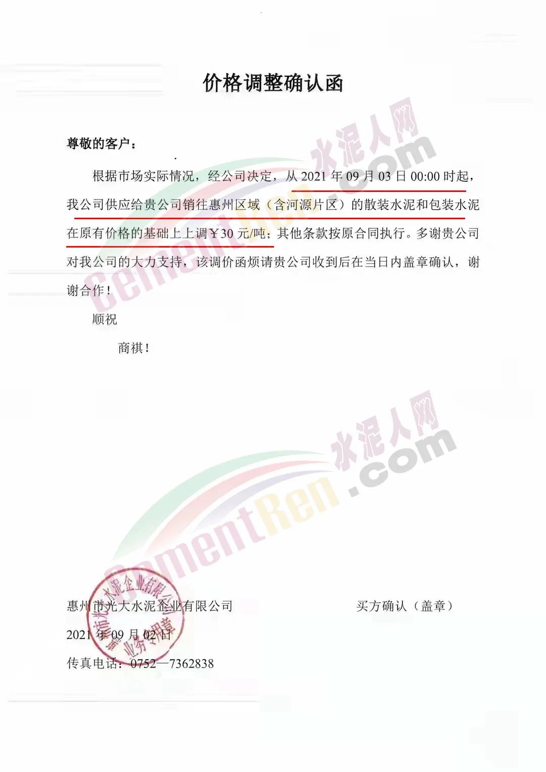 惠州市光大水泥企業有限公司通知,從2021年9月3日0時起,公司銷往惠州區域(含河源片區)的散裝水泥和包裝水泥在原有價格的基礎上上調30元/噸。