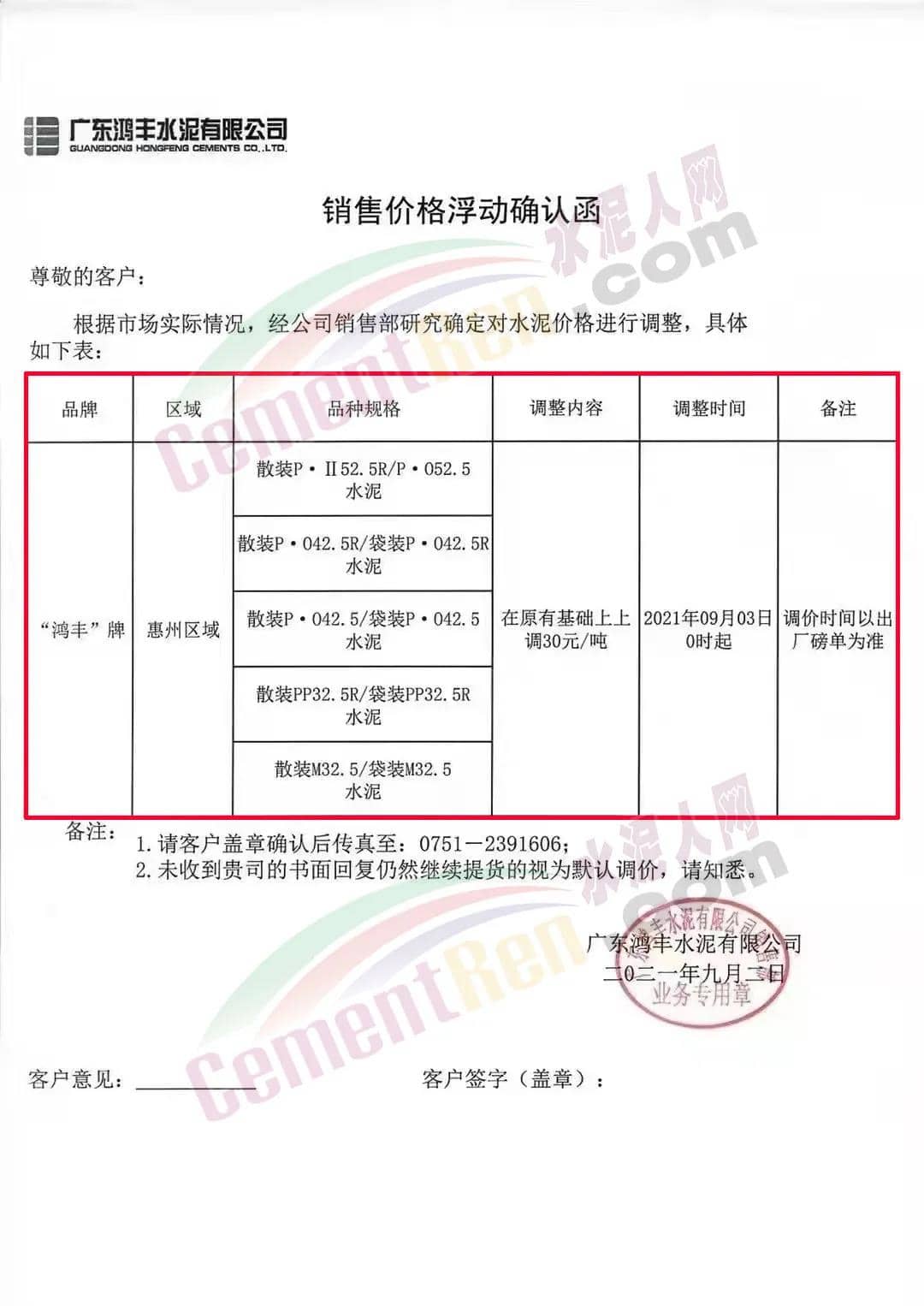廣東鴻豐水泥有限公司通知,自2021年9月3日起,公司惠州區域“鴻豐”牌水泥各標號上調30元/噸。