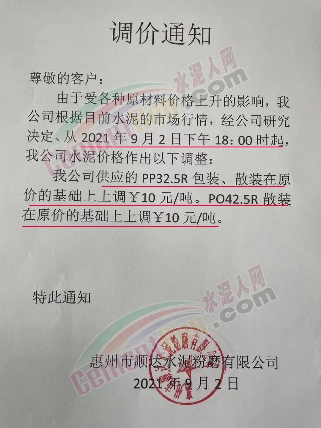 由于受各種原材料價格上升的影響,公司根據目前水泥的市場行情,經研究決定從2021年9月2日下午18時起,公司供應的PP32.5R包裝、散裝在原價的基礎上上調10元/噸。PO42.5R散裝在原價的基礎上上調10元/噸。