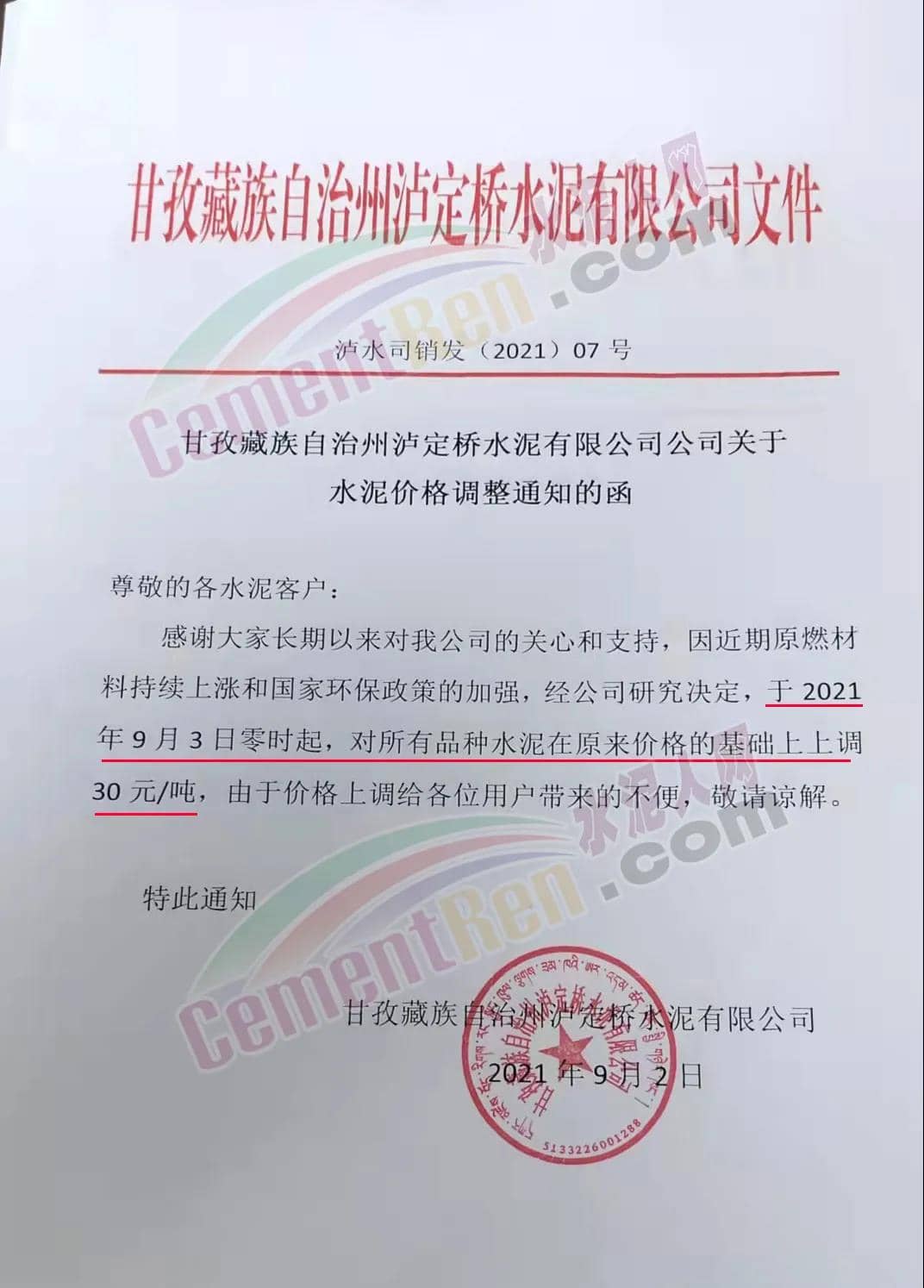 甘孜藏族自治州瀘定橋水泥有限公司通知,因近期原燃材料持續上漲和國家環保政策的加強,經公司研究決定,于2021年9月3日零時起,對所有品種水泥在原來價格的基礎上上調30元/噸。