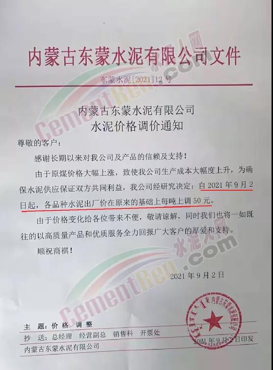 內蒙古東蒙水泥有限公司通知由于原煤價格大幅上漲,致使公司生產成本大幅度上升。為確保水泥供應,經研究決定自2021年9月2日起,各品種水泥出廠價在原來的基礎上每噸上調50元。