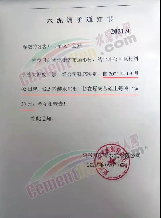 紹興萬年青水泥通知根據目前水泥銷售市場形勢,結合本公司原材料價格大幅度上漲,經公司研究決定,自2021年9月2日起,42.5散裝水泥出廠價在原來基礎上每噸上調30元。