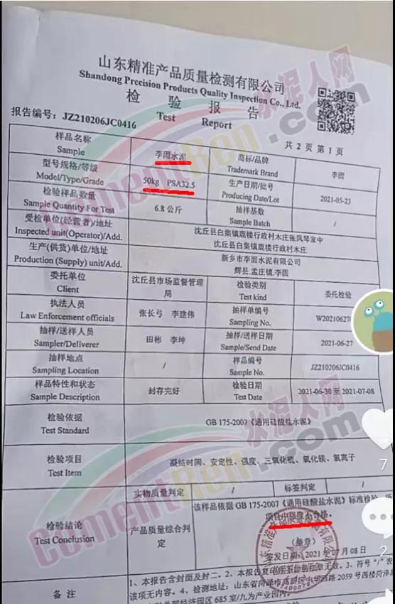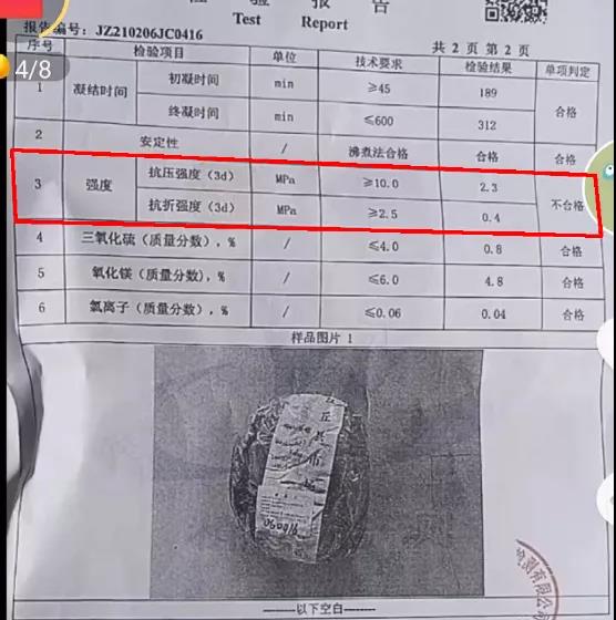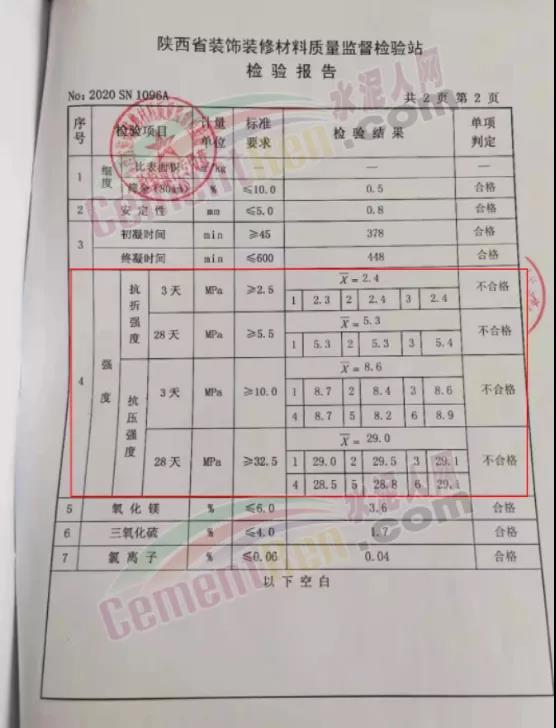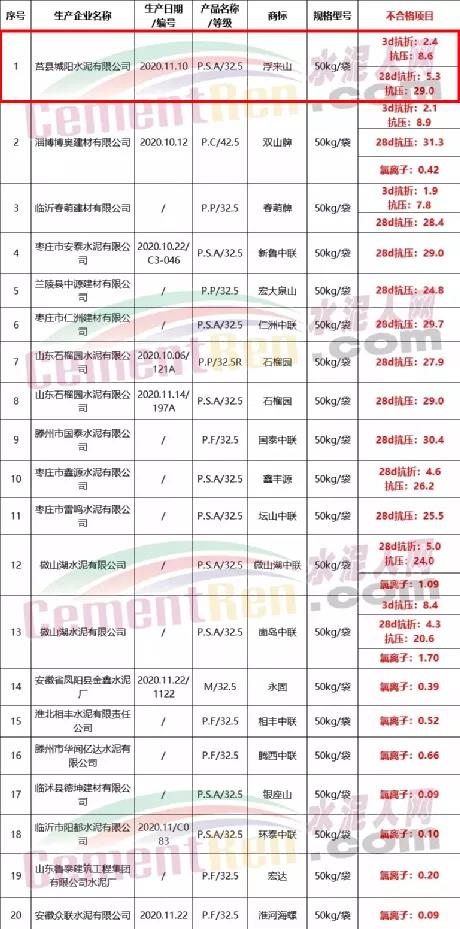 經檢測,共檢出不合格水泥20批次,不合格率高達23.5%。其中抗壓、抗折強度不合格13個批次,氯離子含量超標不合格10個批次。在檢出的不合格水泥中,部分批次28天抗折強度僅為4.3MPa;28天抗壓強度也只有20.6MPa;氯離子達到了1.70,超出國家標準28倍。以莒縣城陽水泥有限公司P.S.A32.5水泥為例,抽檢結果顯示3天強度、28天強度均不達標。