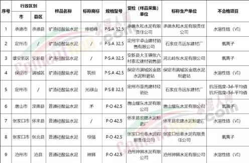 日前,河北省市場監管局公布了8月份水泥質量抽查結果,其中,唐山耀東水泥有限公司、承德永和水泥有限責任公司、張家口恒泰水泥有限責任公司等10批次水泥產品抽檢不合格。