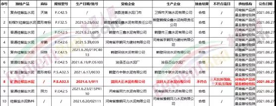 河南省鶴壁市市場監督管理局發布2021年上半年產品質監督抽查結果顯示,淇縣大正水泥有限公司礦渣硅酸鹽水泥P.S.A32.5一個批次不合格,不合格項目為三天抗折強度、三天抗壓強度。