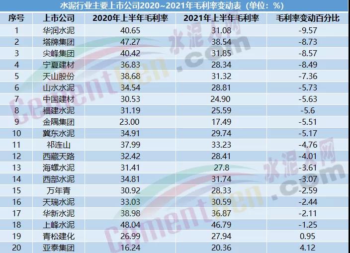 毛利率是企業(yè)在直接生產(chǎn)過程中的獲利能力的財務(wù)反映,代表了企業(yè)核心競爭力。據(jù)水泥人網(wǎng)不完全統(tǒng)計,截止至9月9日,水泥行業(yè)20家發(fā)布半年報的上市公司中,有17家出現(xiàn)了毛利率下滑的現(xiàn)象,占比約為86%,其中,華潤水泥毛利率下滑幅度最大,約為9.57%。