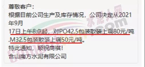 同日,含山南方水泥有限公司通知根據目前公司生產及庫存情況,公司決定從2021年9月17日上午8點起,對PO42.5包裝散裝上調80元/噸。M32.5包裝散裝上調50元/噸。