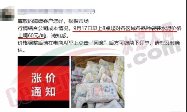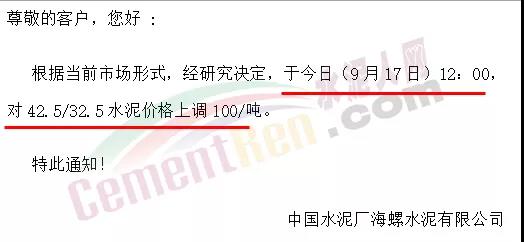 天山股份華東事業部通知,9月16日中午12時起所有水泥品種上調100元/噸。