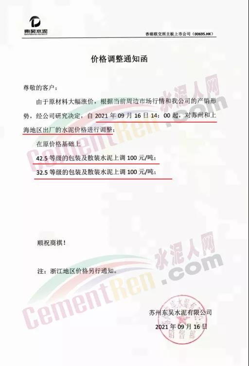 東吳水泥通知,由于原材料大幅漲價,根據當前周邊市場行情及公司的產銷形勢,自9月16日14時起,對蘇州和上海地區的出廠水泥價格上調100元/噸。