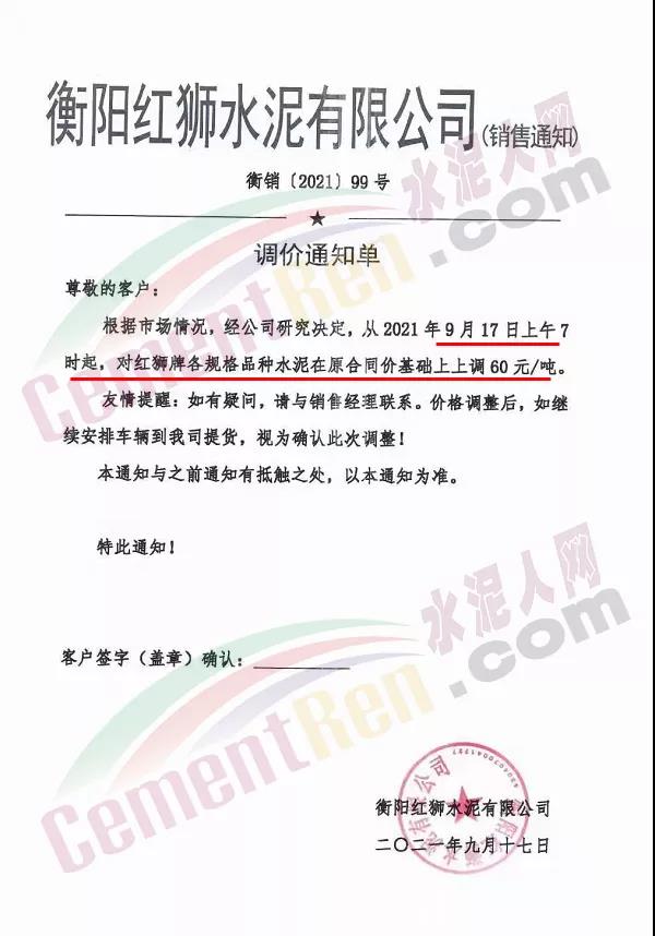 衡陽紅獅水泥通知,自9月17日上午7時起上調各規格品種水泥價格60元/噸。