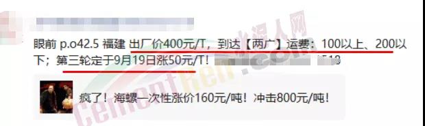 福建地區經銷商通知稱,目前P.O42.5散裝水泥出廠價400元/噸,到達兩廣運費100-200元以下,并預告稱第三輪漲價定于9月19日漲50元/噸。