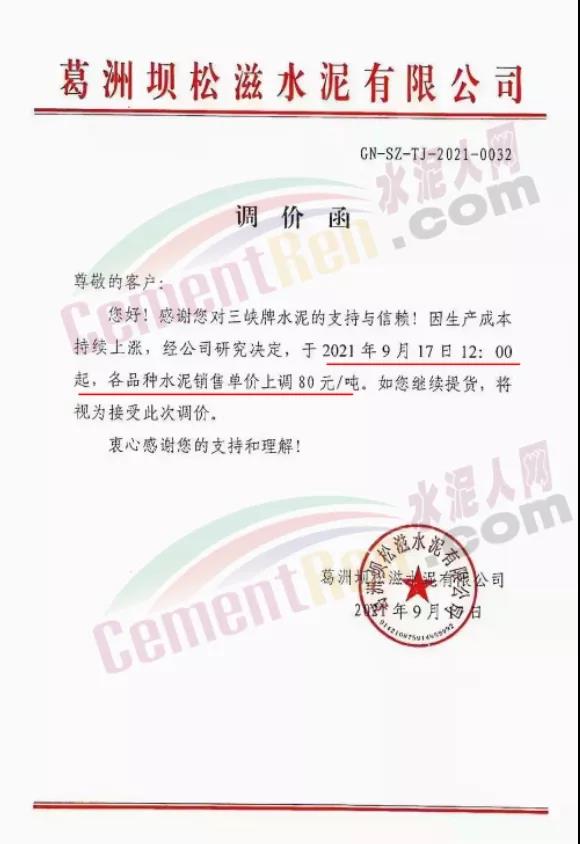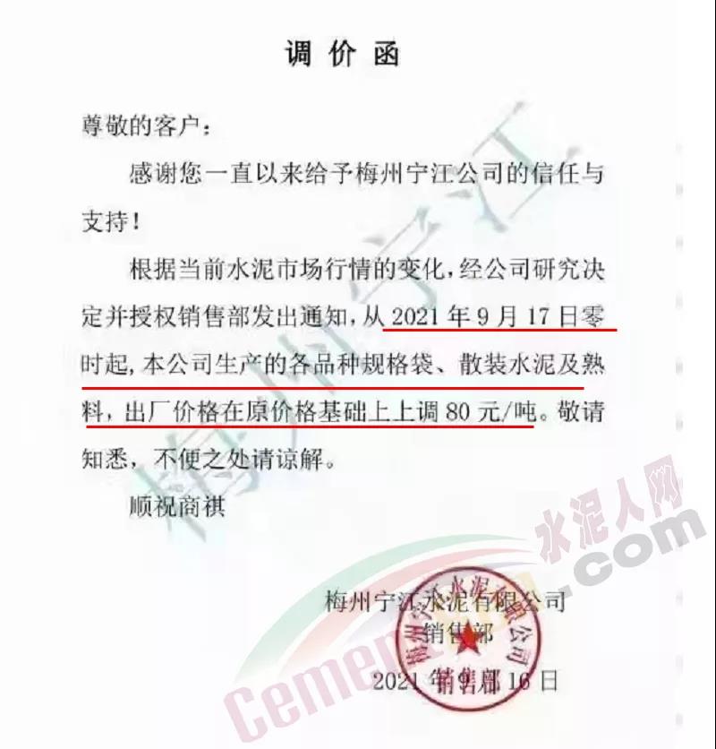 根據當前市場行情,我司決定自2021年9月18日零時起,上調三明區域各品種袋、散水泥價格80元/噸。特此通知!