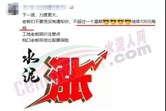 水泥銷售提示說:下一波,力度更大,老板們不要怪沒有通知你,不超過一個星期,繼續漲100元/噸。工地老板報價注意點,檔口老板存貨比買股票保險。