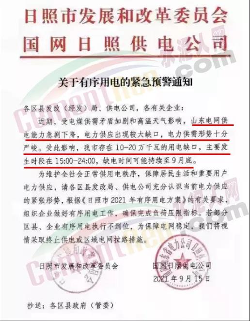 ?日照市發(fā)展和改革委員會國網(wǎng)日照供電公司發(fā)布《關(guān)于有序用電的緊急預(yù)警通知》稱,近期,受電煤供需矛盾加劇和高溫天氣影響,山東電網(wǎng)供電能力急劇下降,電力供應(yīng)出現(xiàn)較大缺口,電力供需形勢十分嚴峻。受此影響,日照市存在10-20萬千瓦的用電缺口,主要發(fā)生時段在15∶00-24∶00,缺電時間可能持續(xù)至9月底。