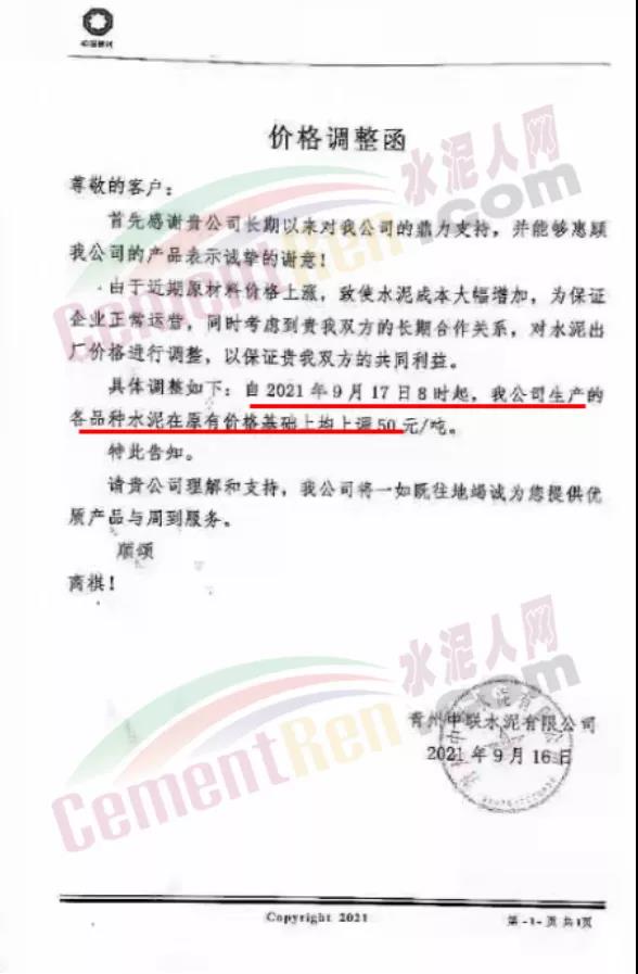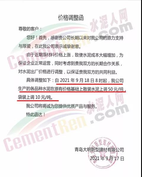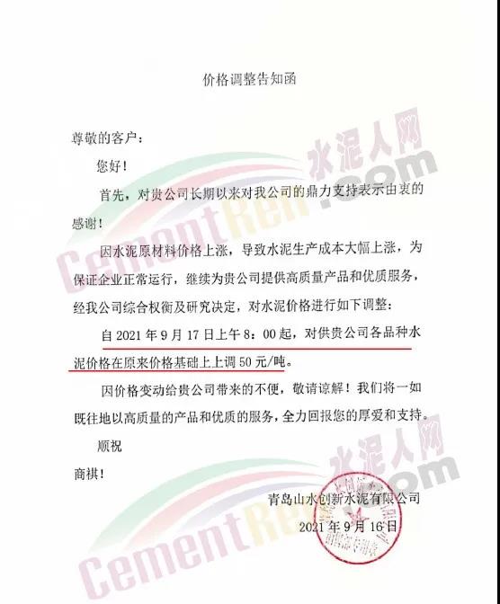 青島山水創(chuàng)新水泥有限公司通知因水泥原材料價格上漲,導(dǎo)致水泥生產(chǎn)成本大幅上漲,為保證企業(yè)正常運行,經(jīng)公司綜合權(quán)衡及研究決定,自2021年9月17日上午8時起各品種水泥價格在原來價格基礎(chǔ)上上調(diào)50元/噸。