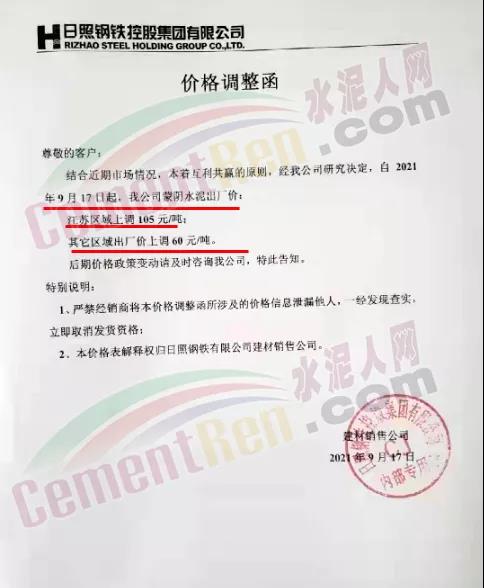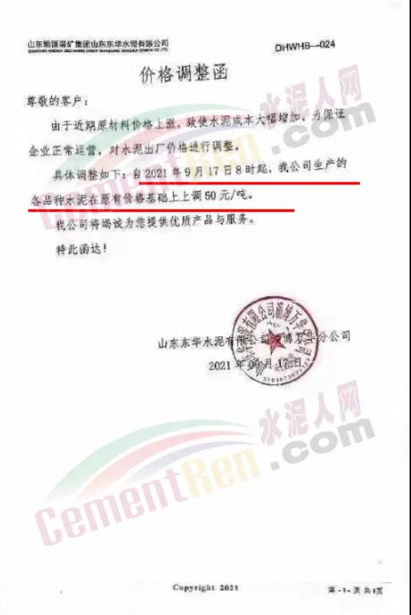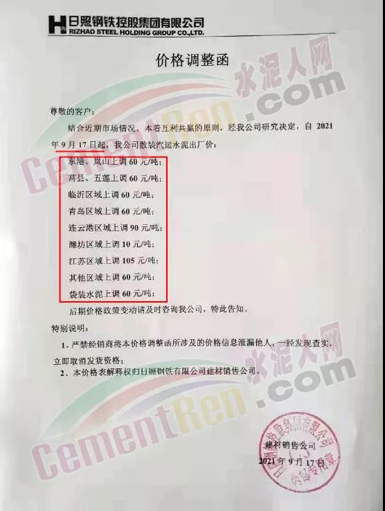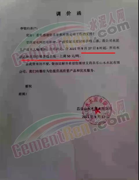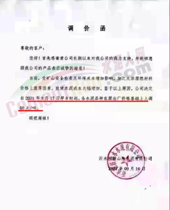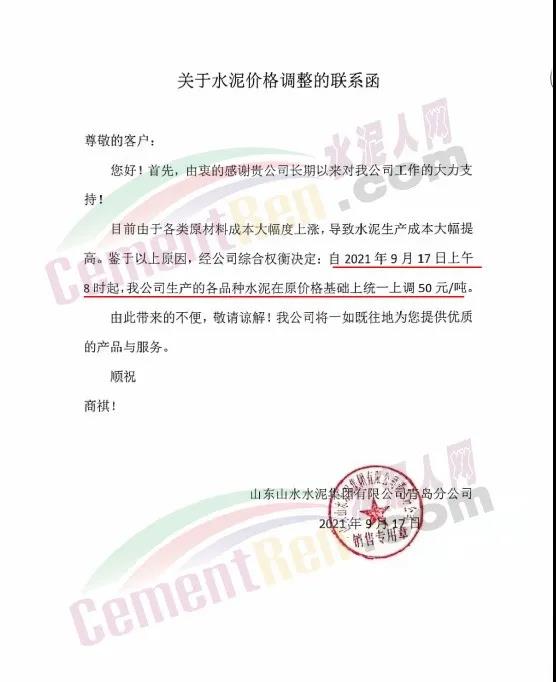 山東山水水泥集團有限公司青島分公司通知由于各類原材料成本大幅度上漲,導(dǎo)致水泥生產(chǎn)成本大幅提高。鑒于以上原因,經(jīng)公司綜合權(quán)衡決定自2021年9月17日上午8時起,公司生產(chǎn)的各品種水泥在原價格基礎(chǔ)上統(tǒng)一上調(diào)50元/噸。